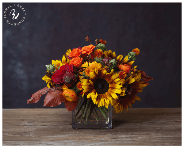 Send this beautiful display of autumn blooms. Featuring a luscious grouping of teddy bear sunflowers, cranberry roses and hints of tangerine and copper colored flowers peppered throughout, this design is perfect for any home or hearth. Price points fluctuate based on flowers added to show off more color for each variation from Standard, Deluxe or Premium.