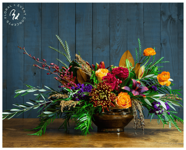 Bronze mums, burgundy lilies, orange roses, burgundy orchids, dark purple matthiola, broomcorn, red garden roses, magnolia, olive branches, podocarpus in a low textured gold container.