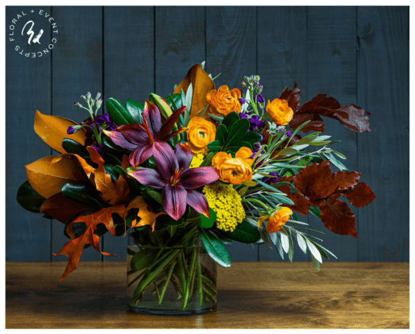 Tones of fall and inspiring blooms of autumn come hand arranged in a glass vase appropriate for a coffee table or desk top. Orange ranunculus, golden yarrow, burgundy lilies and seasonal foliage such as olive, fall toned autumn leaves and copper leather leaf are sure to break your thoughts of summer and dive right into fall.