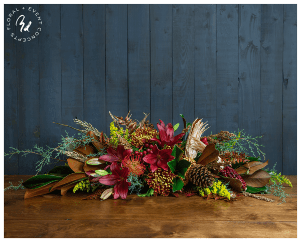 Thanksgiving table centerpiece with burgundy lilies, pincushions, bronze mums, pinecones, burgundy hypericum, broomcorn, magnolia, and arborvitae.