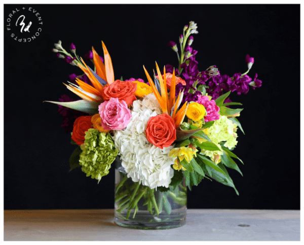Low lush arrangement in bright shades reminiscent of the sunrise such as yellow, orange, pink and purple designed in a glass cylinder vase.