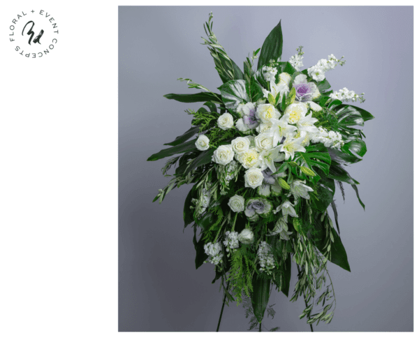 Large standing sympathy spray featuring white blooms like stock, roses, lilies, and kale with a variety of foliage like arborvitae, olive, plumosa, aspidistra and monstera leaves.