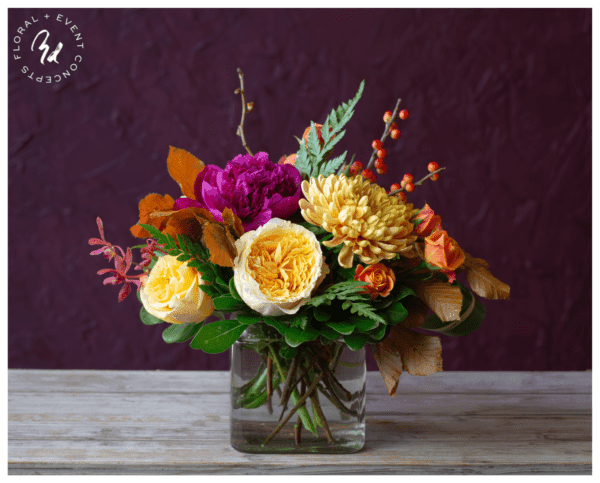 This design features cheerful colors of fall with blooms like garden roses, mums, peonies, ilex berries and copper beech in a clear glass cube.