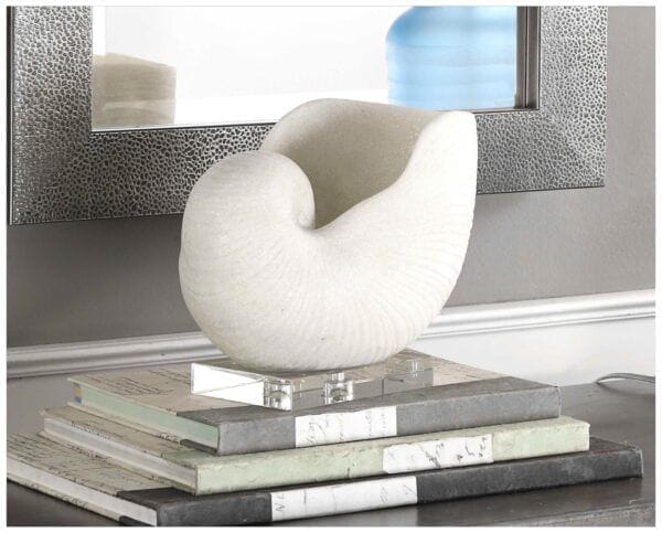 An oversized nautilus shell, crafted from ivory man-made stone that accurately replicates the look of Thassos marble and set on a crystal base.