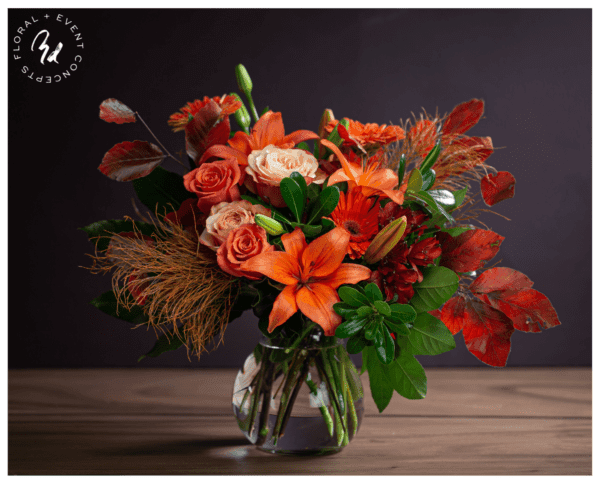 A vibrant palette of fall with blooms of roses, lilies, gerberas and fall foliage designed in a clear glass vase appropriate for a coffee table.