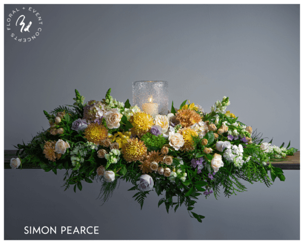 Illuminate the memory of your loved one with this Simon Pearce Sterling Pond Hurricane vase nestled among the beautiful blooms of this casket blanket. This piece features a unique and soothing color palette of lavender, butterscotch, yellow, white and green, with blooms like snapdragons, roses, mums, hydrangea and alstroemeria.