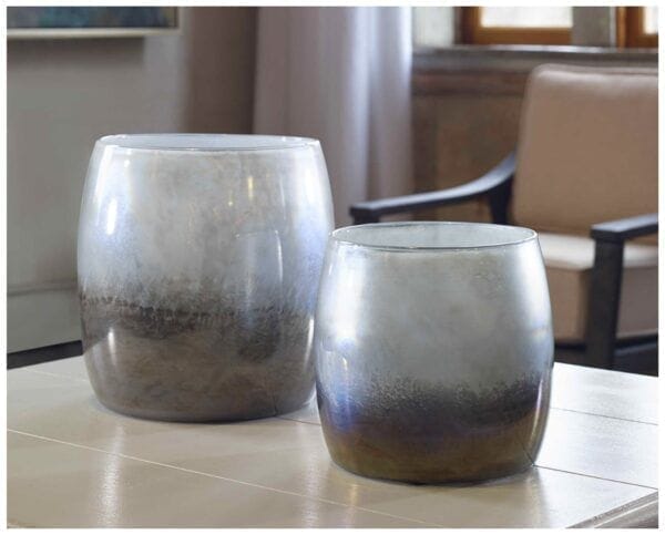 Handcrafted from blown glass, these bowls feature an ombre finish of gray, black and bronze with an iridescent glaze to complete the unique look.